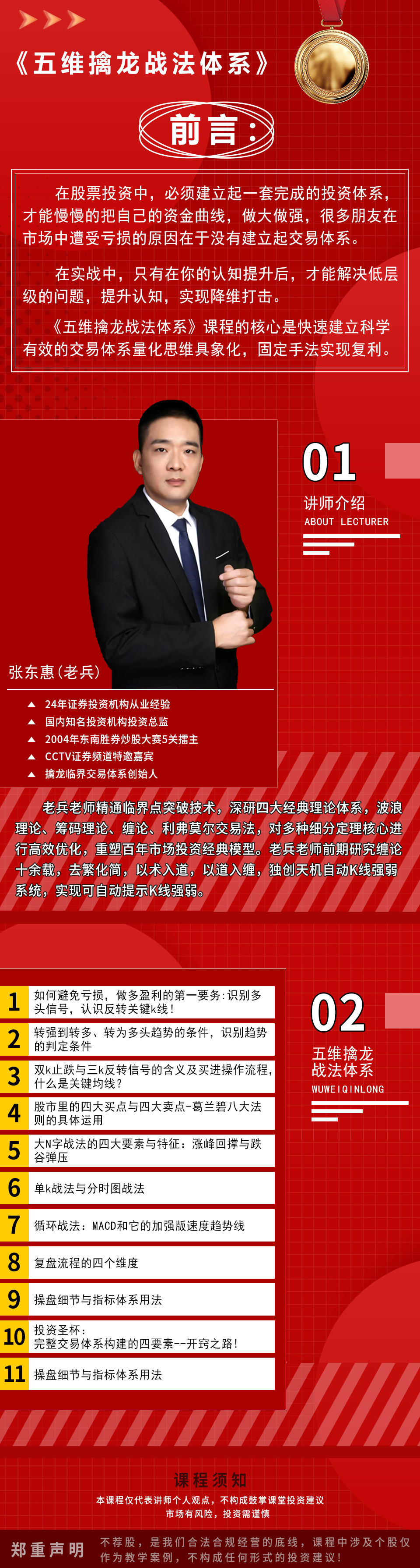 在股票投资中,必须建立起一套完成的投资体系才能慢慢的把自己的资金曲线,做大做强,很多朋友在市场中遭受亏损的原因在于没有建立起交易体系。 在实战中,只有在你的认知提升后,才能解决低层级的问题,提升认知,实现降维打击《五维擒龙战法体系》课程的核心是快速建立科学有效的交易体系量化思维具象化,固定手法实现复利。